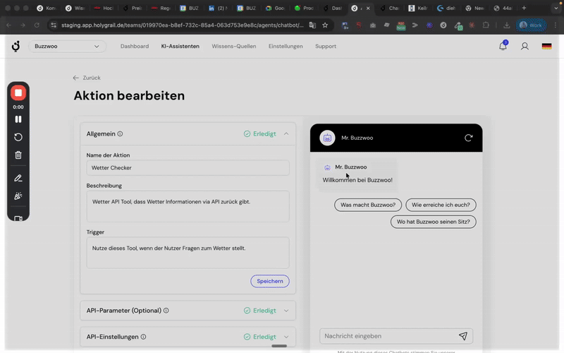 Der Assistent erfragt automatisch alle benötigten Informationen, nutzt die verfügbaren Aktionen und führt die entsprechenden Schritte aus. Die Einrichtung erfolgt vollständig ohne Programmierung – ausschließlich über einfache, natürliche Sprachanweisungen.